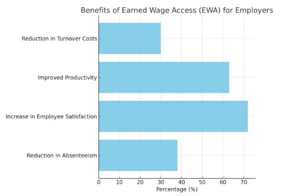 - 38% Reduction in Absenteeism: Companies with EWA report a 38% decrease in absenteeism due to financial stress. Employees feel more secure, leading to fewer missed workdays. (AdvanStaff, 2023)
